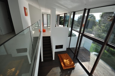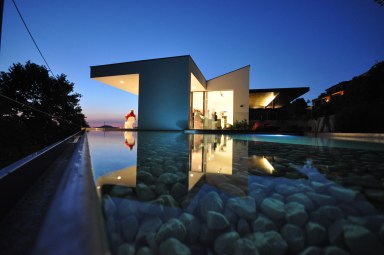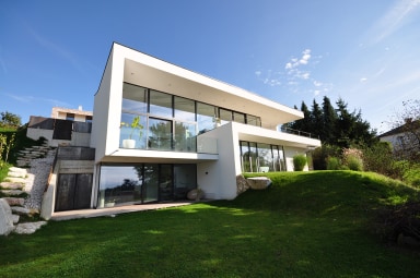 Das Thema Wasser spielt bei diesem beeindruckenden Gebäude in Hanglage eine zentrale Rolle. Den Blick auf die umliegende Natur und das Wasser geben die großflächigen FixFrame Glaselemente frei. So werden die Übergänge zwischen innen und außen wortwörtlich fließend.