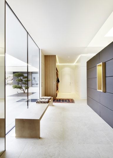 Herzstück ist die Südfront, die durch das großdimensionierte FixFrame Blue Vision Ganzglassystem Innenraum mit Garten und Schwimmteich verschmelzen lässt.