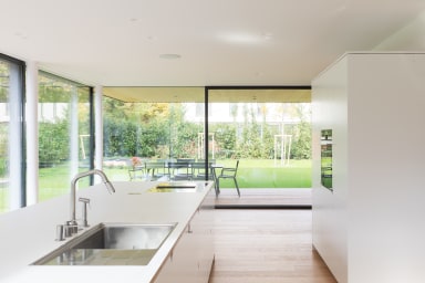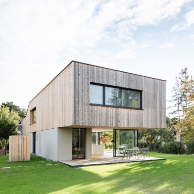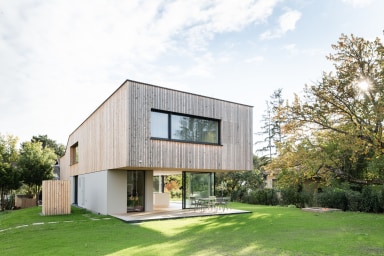 An den südlichen Ausläufern des Wienerwaldes gelegen, bietet dieses Haus einen stillen Rückzugsort für eine junge Familie. Besonders und gleichzeitig prägend für die Gestaltung des Hauses ist der natürliche, leichte Niveauunterschied zwischen Straße und dem darüberliegenden Garten, der durch vier halbgeschosshoch versetzte Wohnebenen intelligent überbrückt wird.
