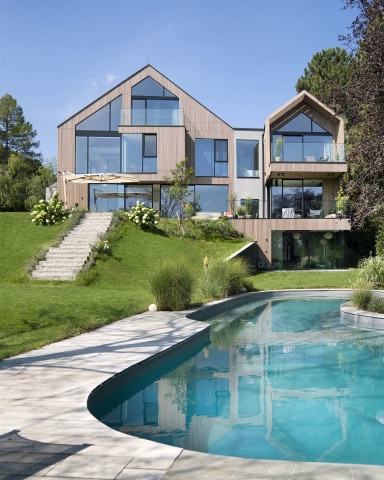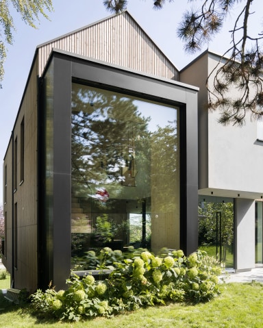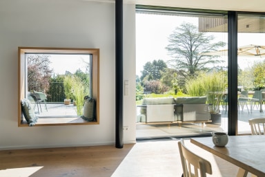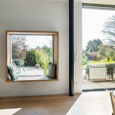 Das lichtdurchflutete Holzhaus „Lindlux“, umgeben von majestätischen Linden, beeindruckt durch sein ausgewogenes Design. Drei ineinander übergehende Baukörper – zwei Satteldächer und ein mittig platzierter, keilförmiger Kubus – bilden ein L-förmiges Ensemble. Diese Form ermöglicht weitläufige Glasfronten, die den Innenraum großzügig zum Garten hin öffnen, das Sonnenlicht optimal einfangen und die Grenzen zwischen Innen- und Außenbereich fast verschwinden lassen.
