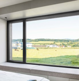 - Flächenbündig: Fixverglasungen und öffenbare Elemente werden an der Außenseite flächenbündig verbunden - für großzügige Glasfronten in einer Ebene.